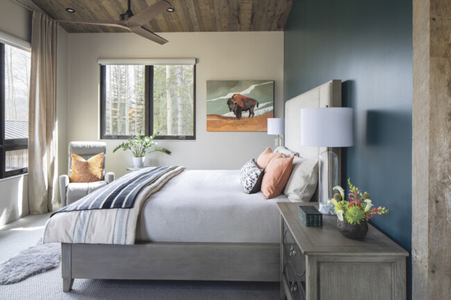 “We’re really inside an aspen grove,” says Alvarez of the home. “So many of the rooms feature the trees toward the back.” Windows frame the dense forest on three sides of the property, and the living room and wrap-around deck face Paradise Divide to the north.